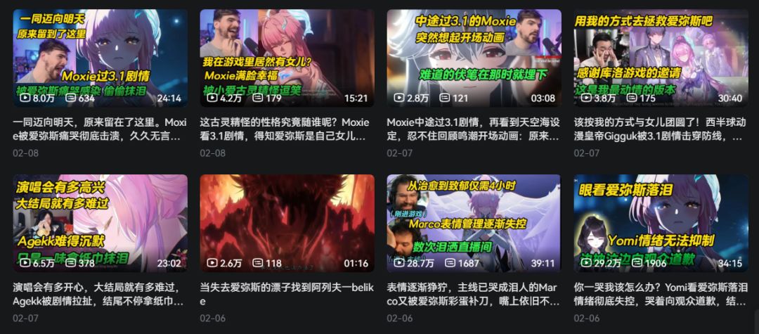 而《鸣潮》这类内容向游戏的剧情则还有一些不同——一层是粉丝团建、串子玩梗大乱斗的氛围;另一层是以“过来人”的上帝视角,看着主播作为一个即将“受害”的人,还不知道要发生什么……最终看着她为剧情流泪,再次强化共鸣,引爆情绪——这一整套体验,包含了戏谑、共情、期待、宣泄、掌控感、归属感等多种复杂情感,实在是生活里不可多得的体验。