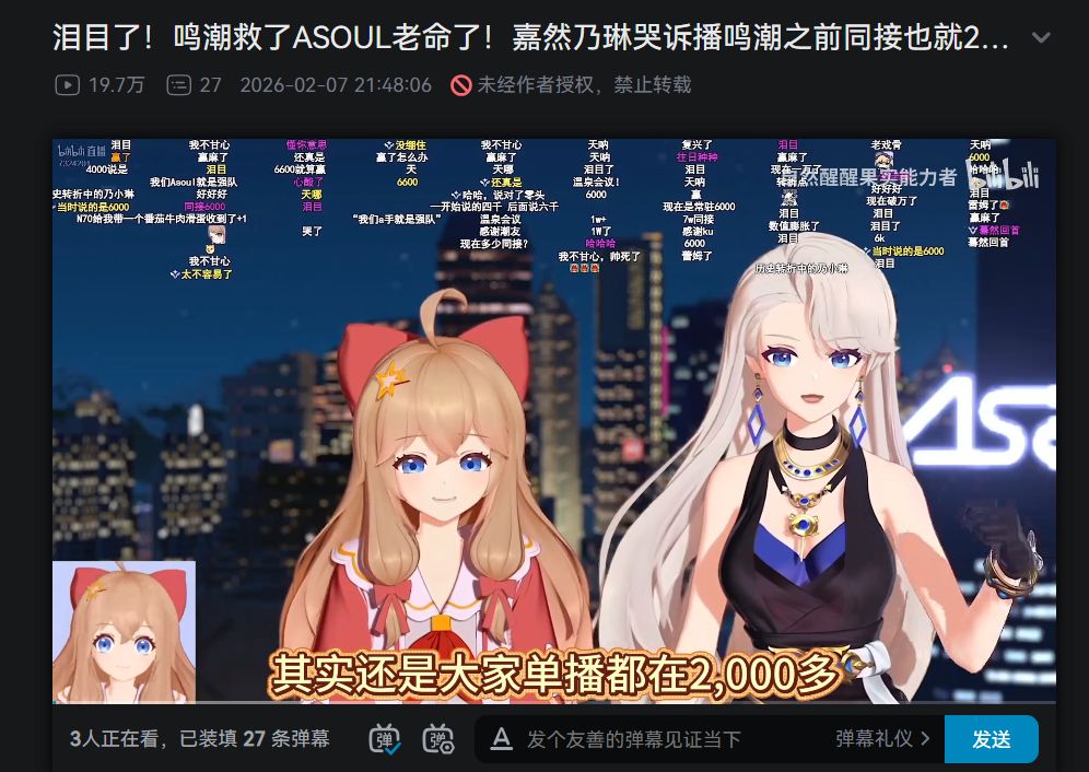 2月11日,虚拟偶像团体A-SOUL的成员 @乃琳QUEEN 直播游玩《鸣潮》3.1版本剧情,直播间同接一路走高,最终突破了22万。