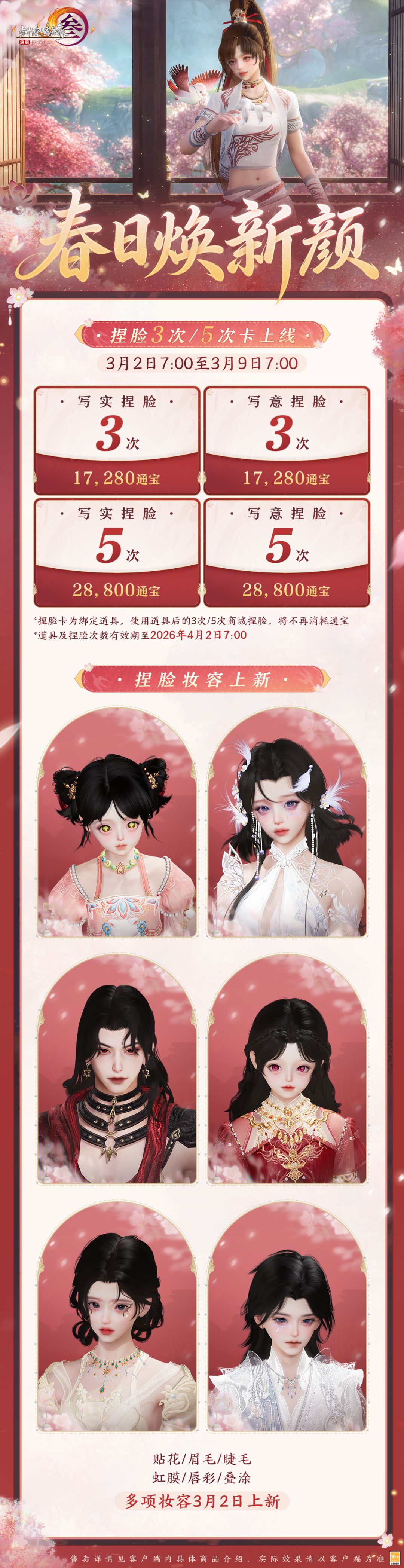 购买【云鬓脂】系列发型染色道具限时享8.5折折扣,超值一口价捏脸卡限时返场!还有多项妆容上新,且趁韶华开胜景,共赴今朝好春光!