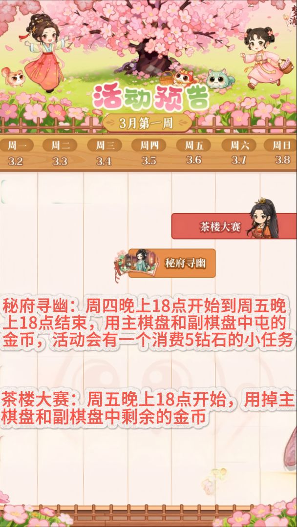 4.秘府寻幽:周四晚上18点开始到周五晚上18点结束,用主棋盘和副棋盘中屯的金币,活动会有一个消费5钻石的小任务。