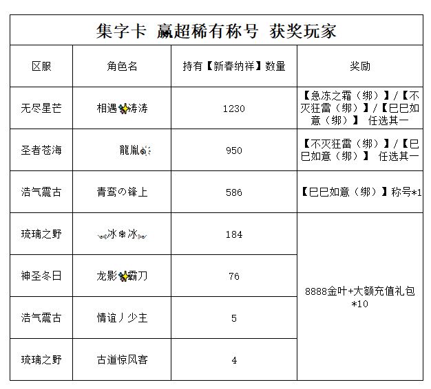 恭喜以下获奖玩家,奖励将于7个工作日内发放,玩家可自行将相关道具进行清理。请部分获奖角色在获奖名单发布后的五个工作日内,通过游戏内发送客服邮件登记活动奖励,逾期未登记将按原定奖励发放,如有疑问请及时联系客服~