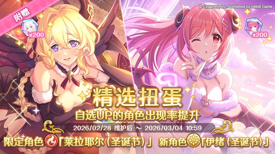 2月28日维护后,期间限定角色★3「莱拉耶尔(圣诞节)」(CV:河濑茉希)、新角色★3「伊绪(圣诞节)」(CV:伊藤静)正式登场!
