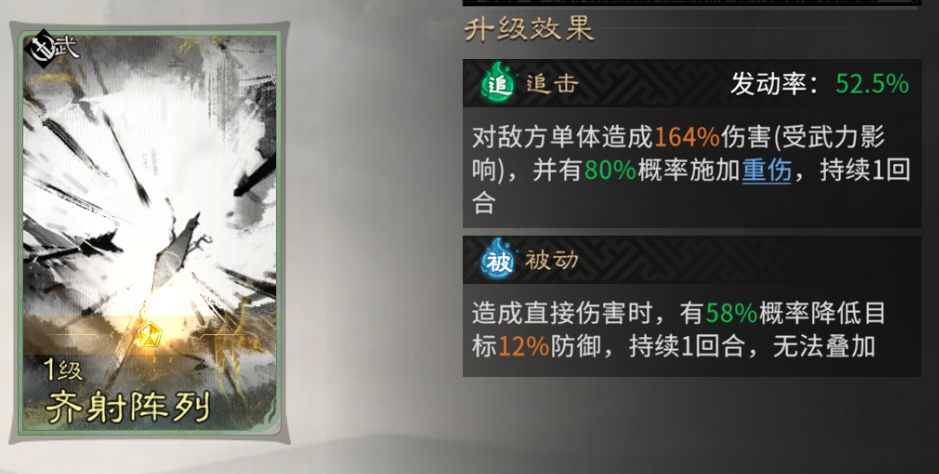 追击技能固定携带【横刀耀武】,对敌方武力最低单位造成高额伤害,定点打击,让敌方快速减员。