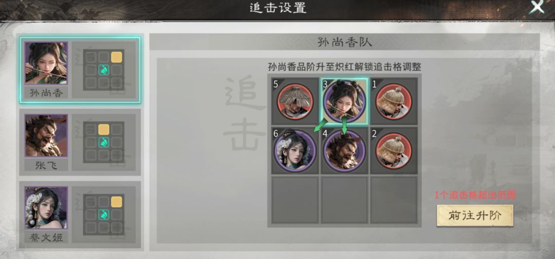 英雄站位:蔡文姬与张飞不站追击格,孙尚香站蔡文姬与张飞的追击格。