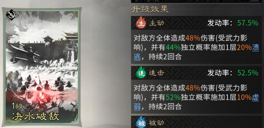 主动技能固定携带【决水破敌】,对敌方全体造成伤害,并有概率施加1层溃逃。