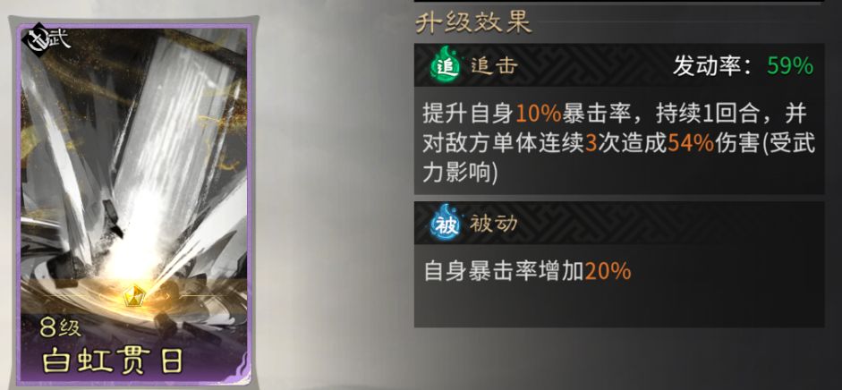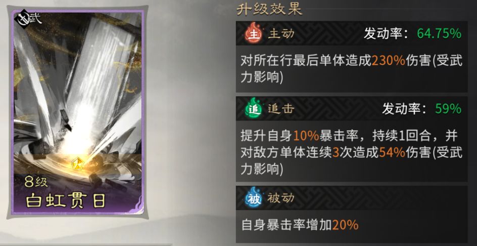主动技能固定携带【白虹贯日】,对所在行最后一个敌人造成极高的单体伤害,可以对敌方后排精准打击。
