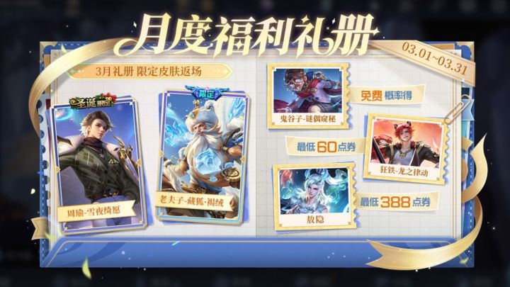 3月月度福利礼册将于3月1日正式开启,本次礼册惊喜折扣奖池更新,周瑜-雪夜绮愿、老夫子-藏狐·褐绒两款史诗限定皮肤限时返场,玩家可通过刷新奖池获取折扣,以优惠价格兑换。奖池内还保留鬼谷子-谜偶窥秘等皮肤,可供玩家免费概率抽取。