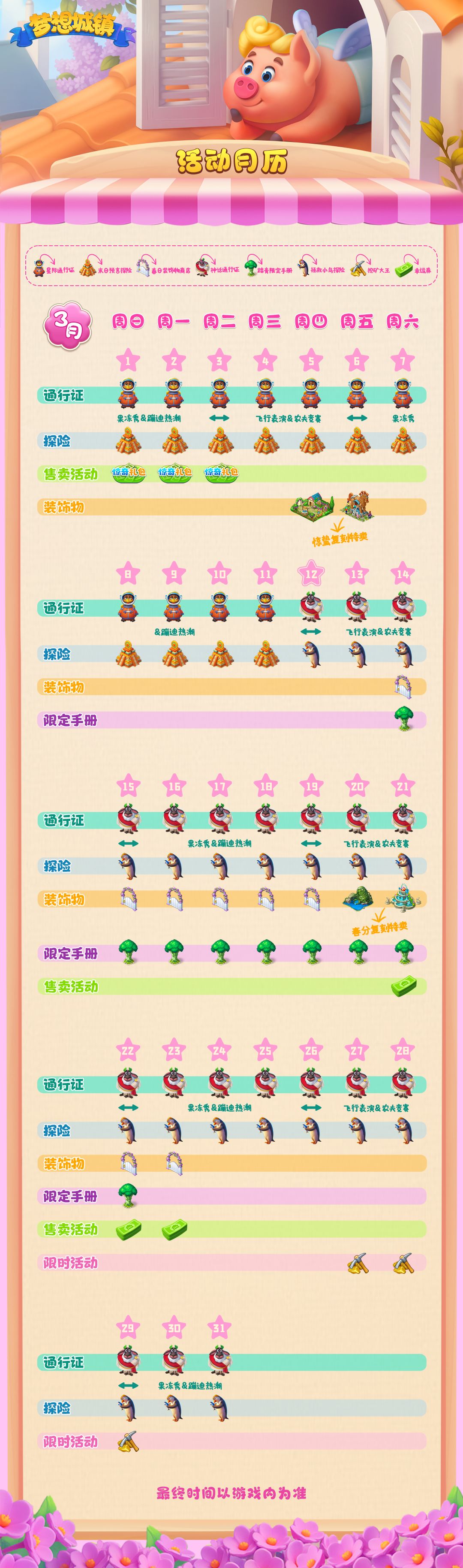 【梦想城镇】已为大家标注了游戏内3月活动时间,具体请以游戏内实际活动时间为准喔
