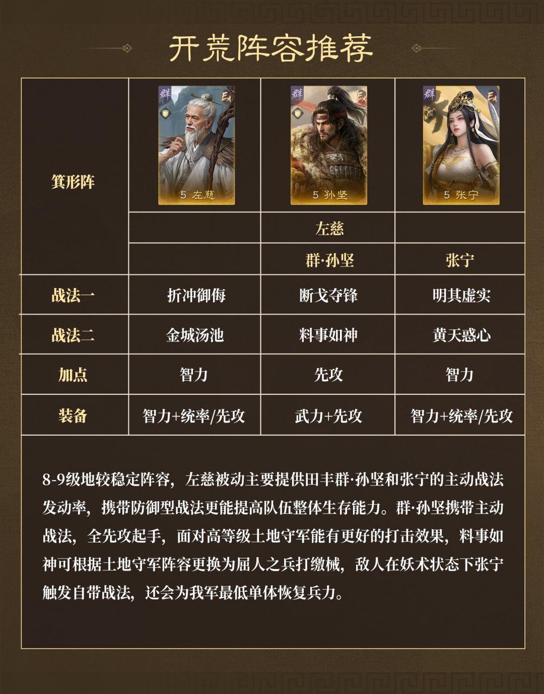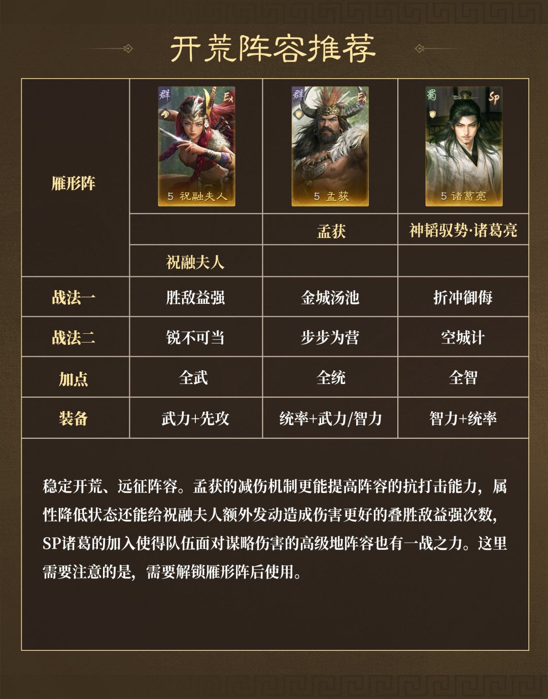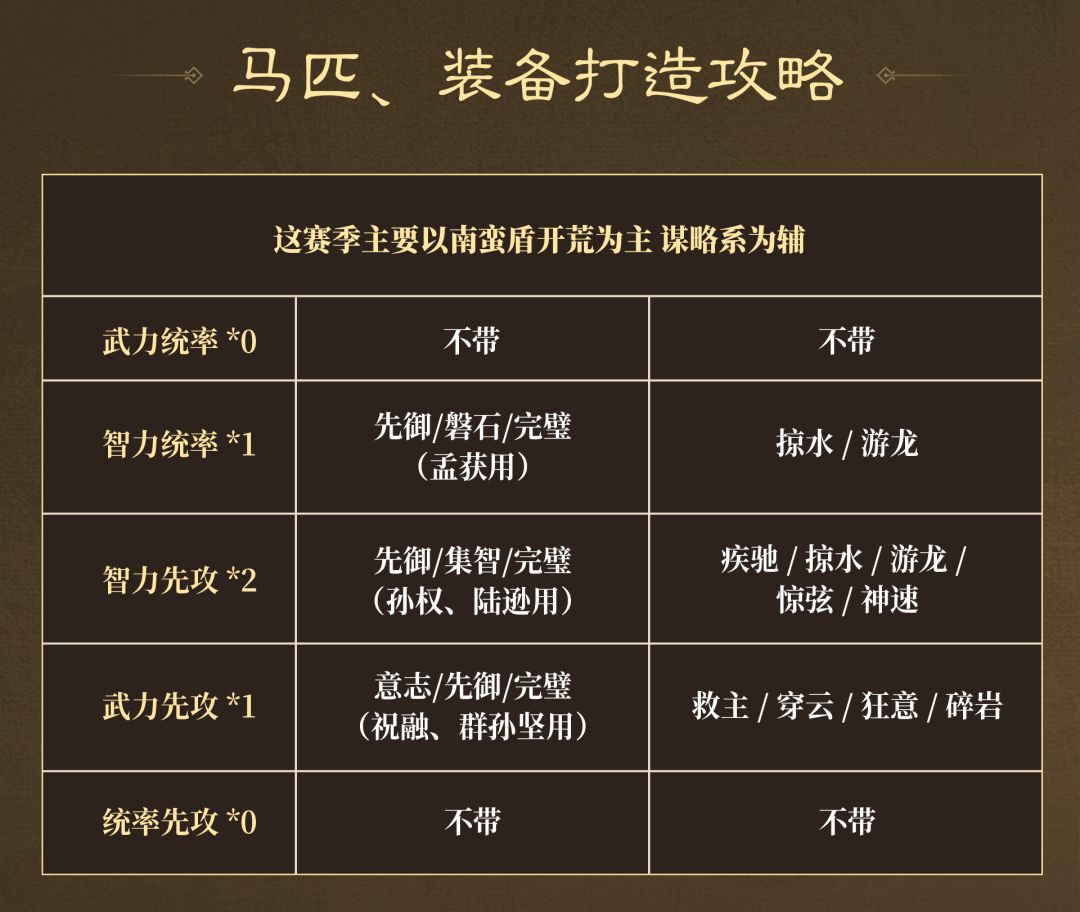 以开荒为主,由于新赛季群孙坚的加入,且南蛮队可以从开荒用到打架,所以装备携带以武力先攻为主,谋略系队伍通用为辅。