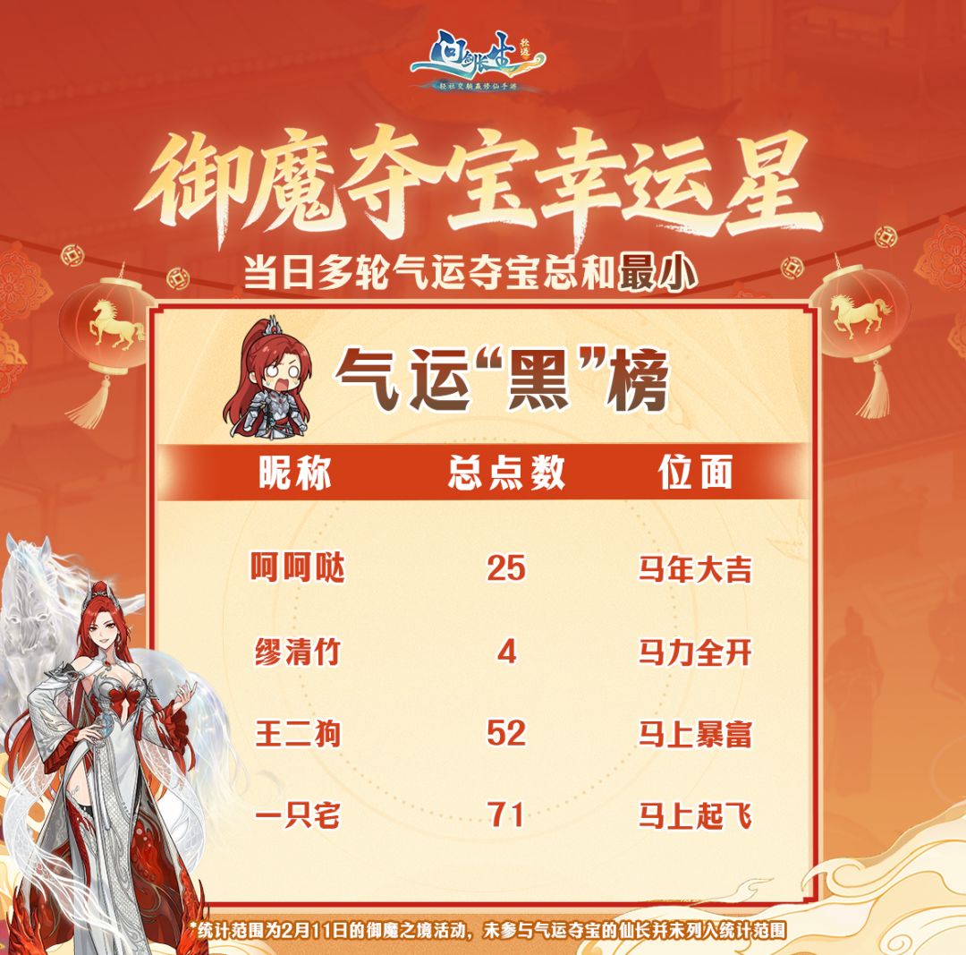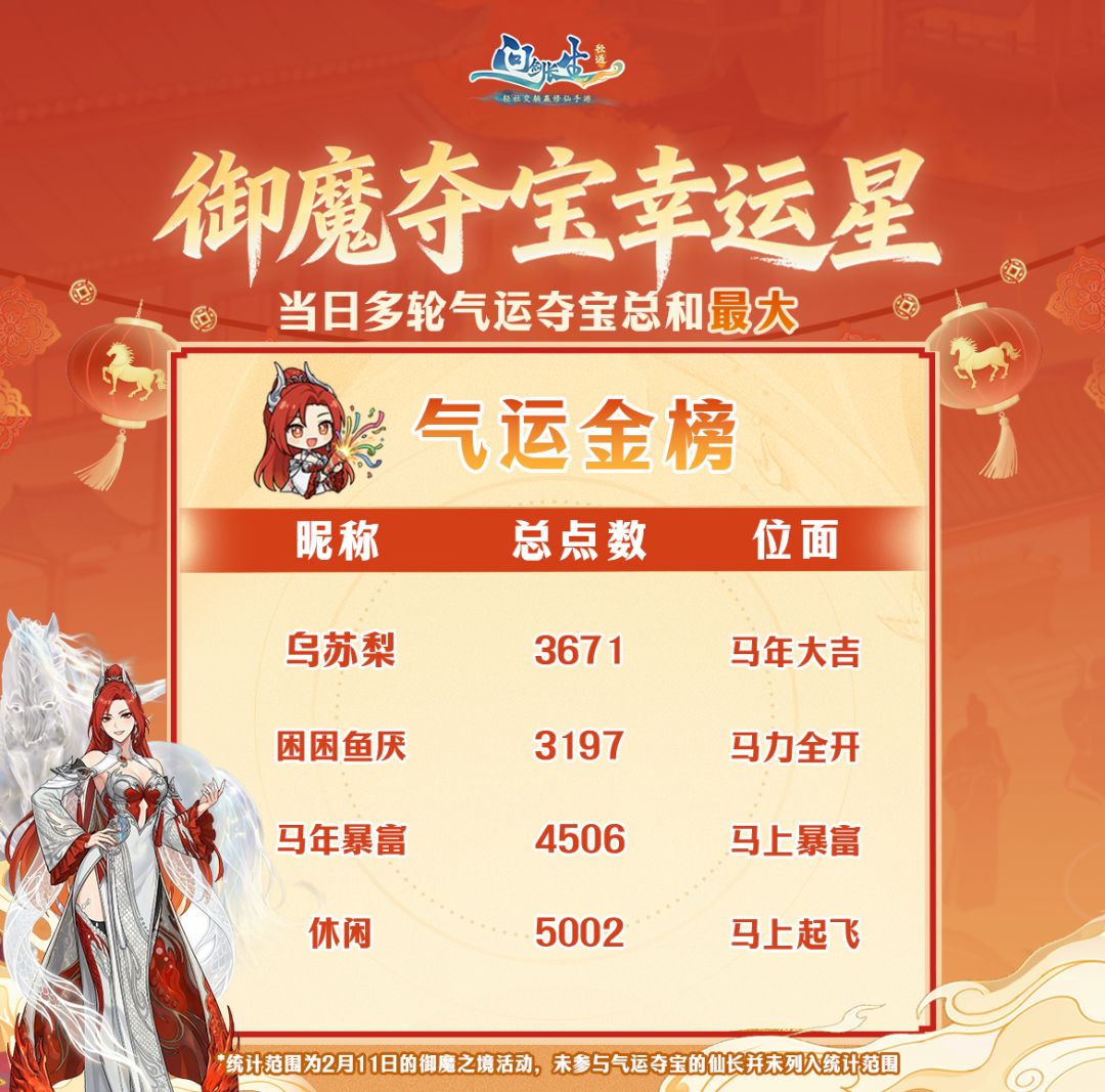 既然叫鸿运主题服,怎么能少的了气运之子的出现呢?2月21日当日的气运夺宝活动中,下列仙长携新年鸿运,勇夺气运大奖!