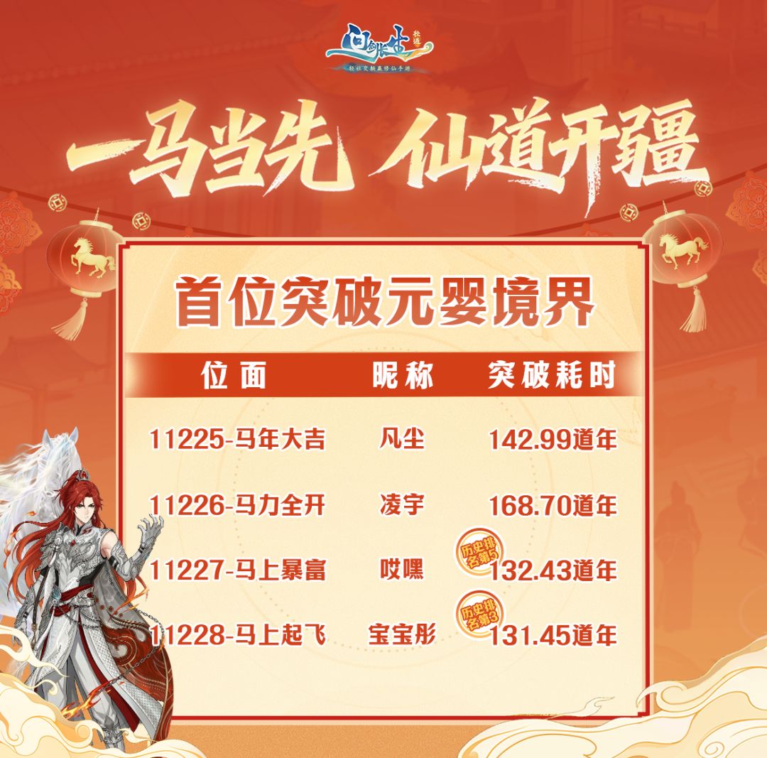 除了在本服的修行速度一骑绝尘,来自11227-马上暴富的【哎嘿】仙长,则是以约132.43道年的速度,在问剑历史上最快突破元婴修士中排名第五;