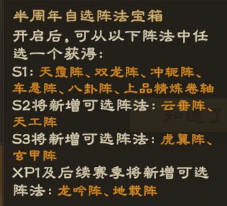 3. “半周年自选武将宝箱” 和 “半周年自选阵法宝箱” 为稀有奖励,开启前请仔细查看可选内容,选择最适合自己的奖励;