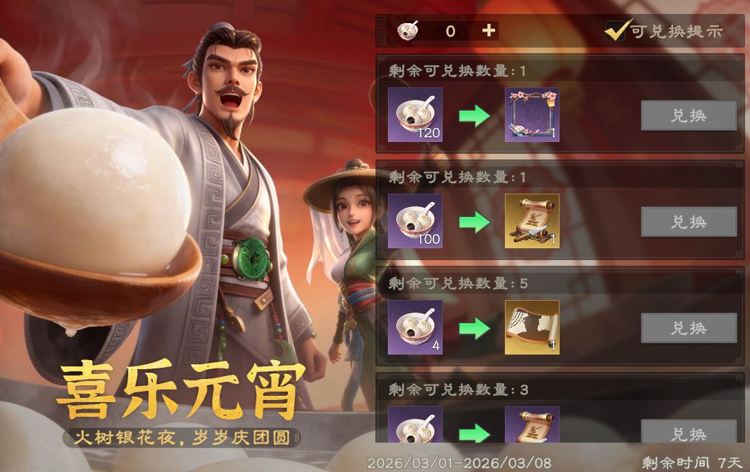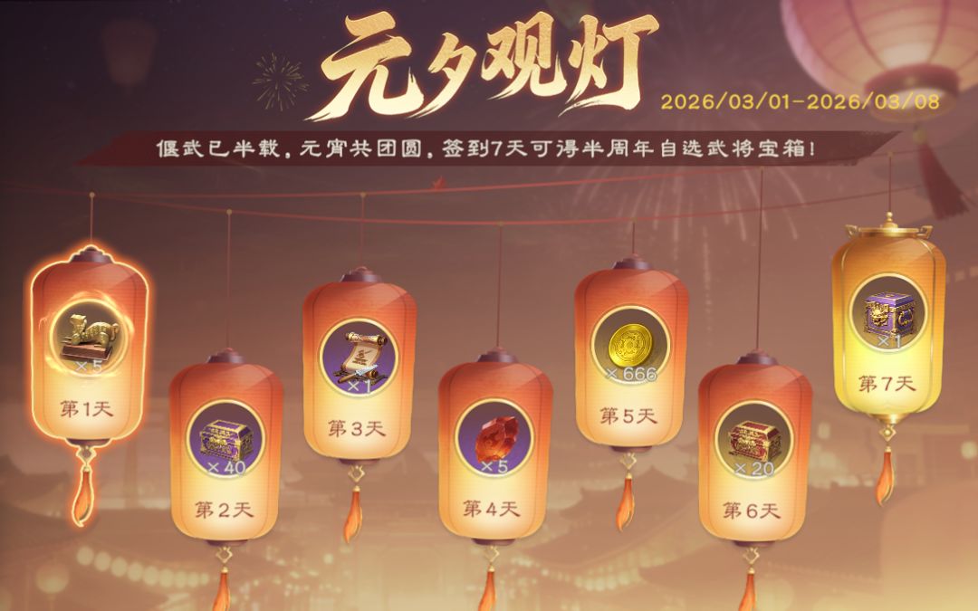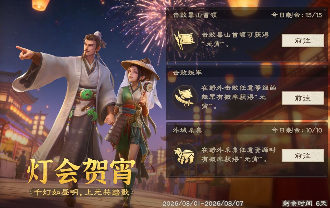 2. 除 “元夕观灯” 和 “喜乐元宵”、“元夕韶礼” 活动持续至3月8日外,其余活动将于3月7日 23:59 结束,请主公合理安排时间参与;