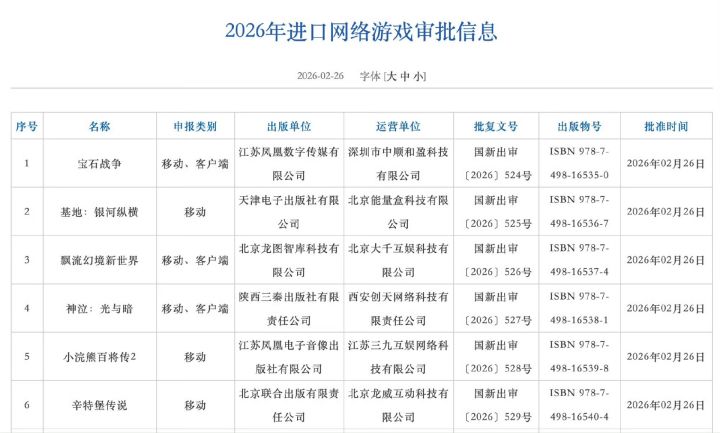【快讯】2026年2月游戏版号正式下发