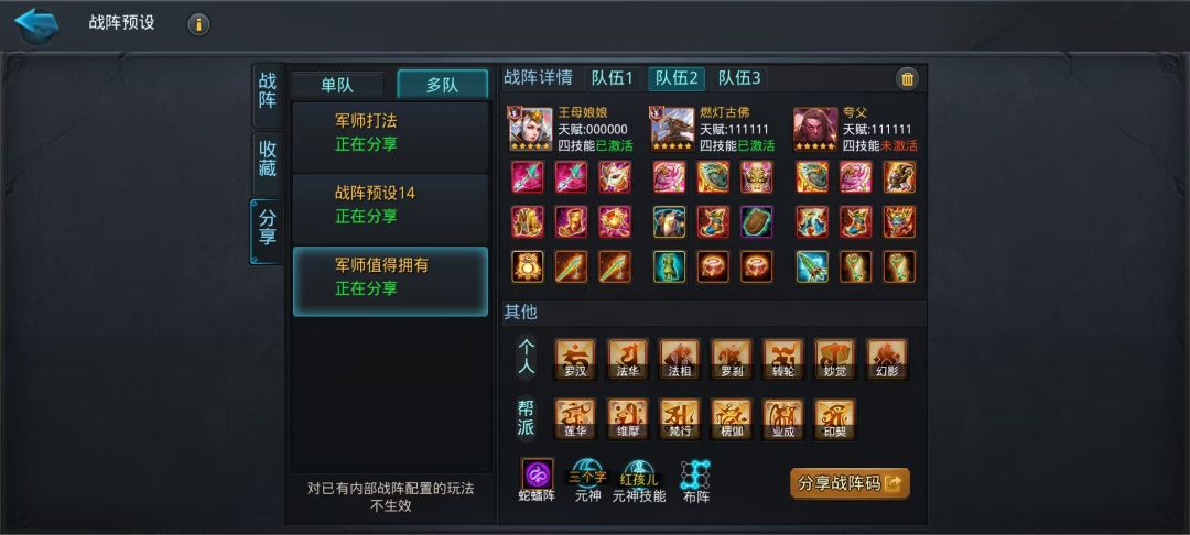 考虑到解锁异技能组的玉皇大帝被动范围性伤害非常高 ,搭配魍魉附身增伤和阿修罗王的被动增伤,从而组成了伤害爆发队。
