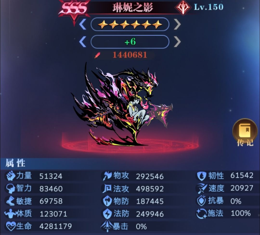 先看基础面板,琳妮满配时法攻498592,觉醒后598310,跟亚当几乎没差别;速度20927,觉醒后25112,比亚当快697,也就说如果法队内战,亚当法遇到琳妮法就很吃亏了,这是其中一个不得不换的理由。
