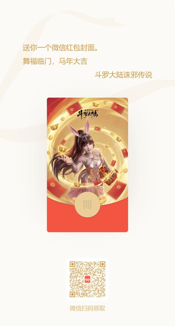 舞”福临门,骐骥驰骋!斗罗大陆诛邪传说专属新年红包来啦~各位魂师在微信扫码下面的页面即可领取啦,数量有限先到先得!新年过后,我们将会给大家带来重磅消息,敬请关注各大官方渠道和预约游戏哦~最后小舞祝大家春节快乐,新的一年平平安安,幸福美满!