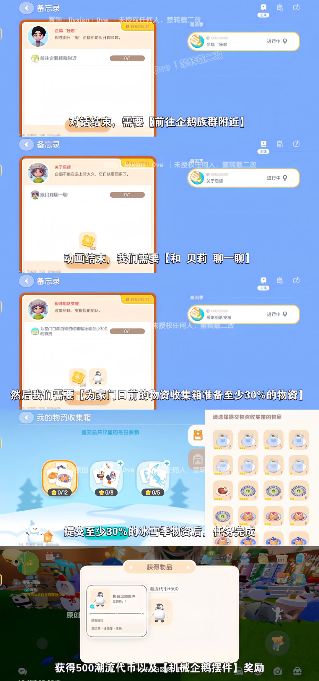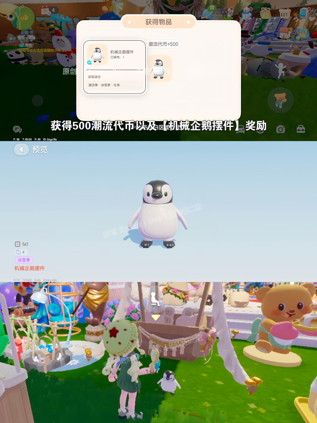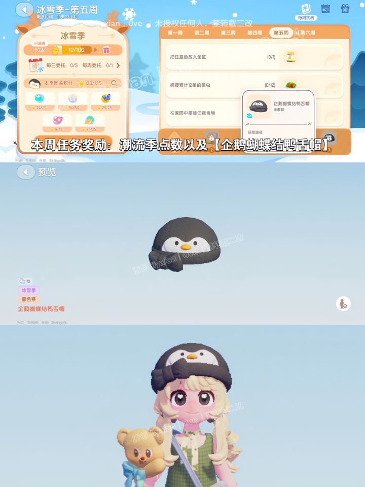 完成本周相应任务,可以获得【企鹅蝴蝶结鸭舌帽】、【雪人相机包】以及【机械企鹅摆件】,大家不要错过啦。