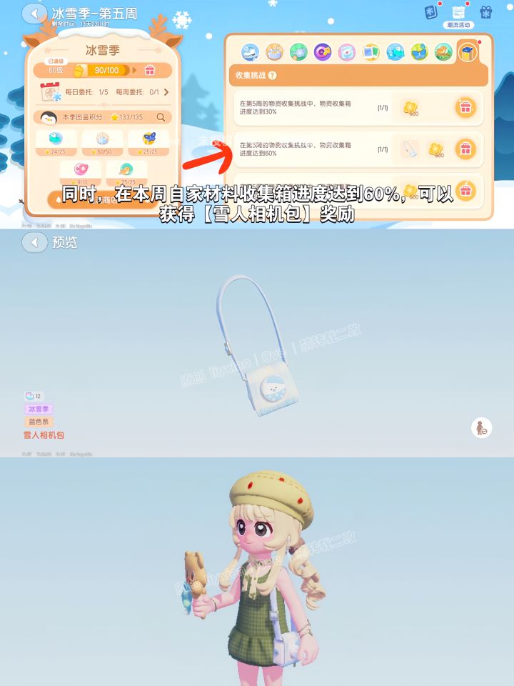 在本周自家材料收集箱进度达到60%,可以获得【雪人相机包】奖励 (图3)。(!只能在本周获得!)