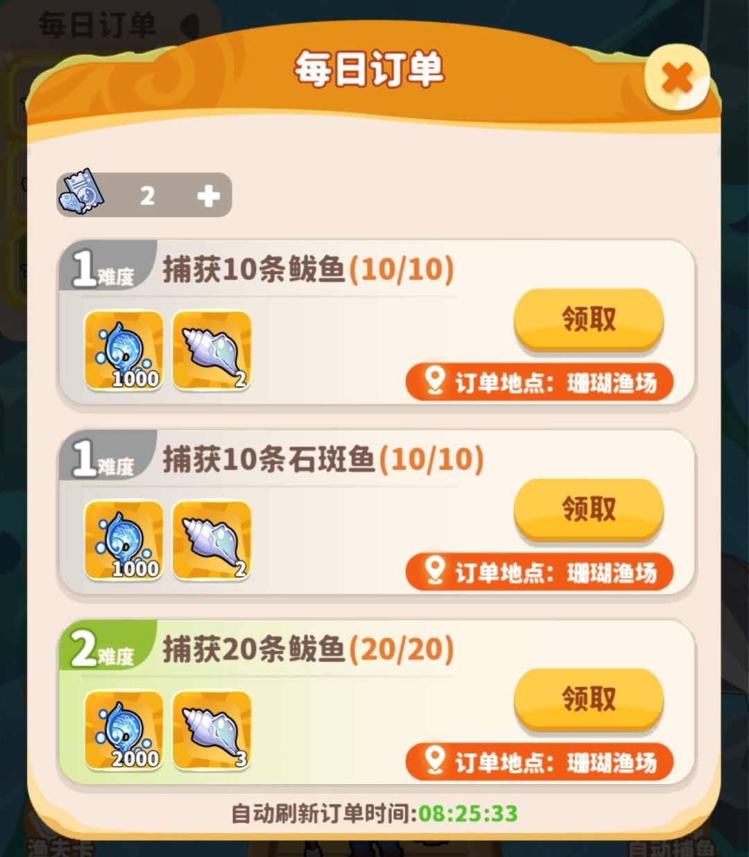 每天刷新3个订单任务,完成后可获得渔夫经验和玉化海螺!