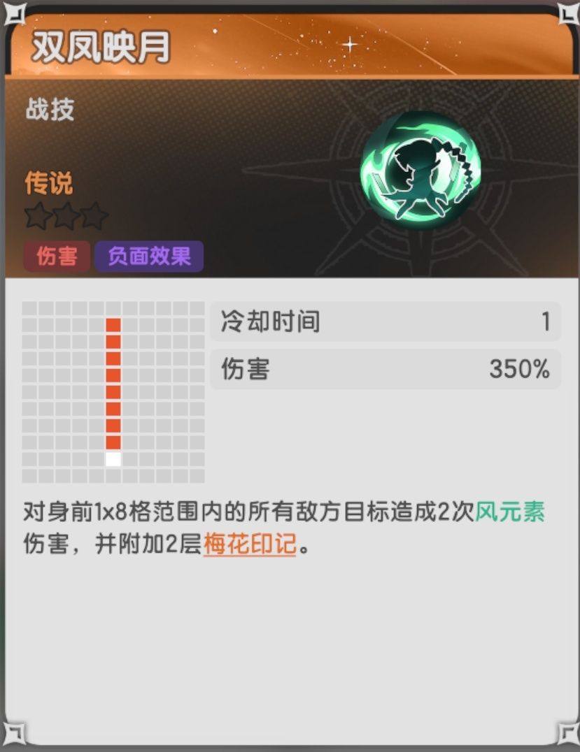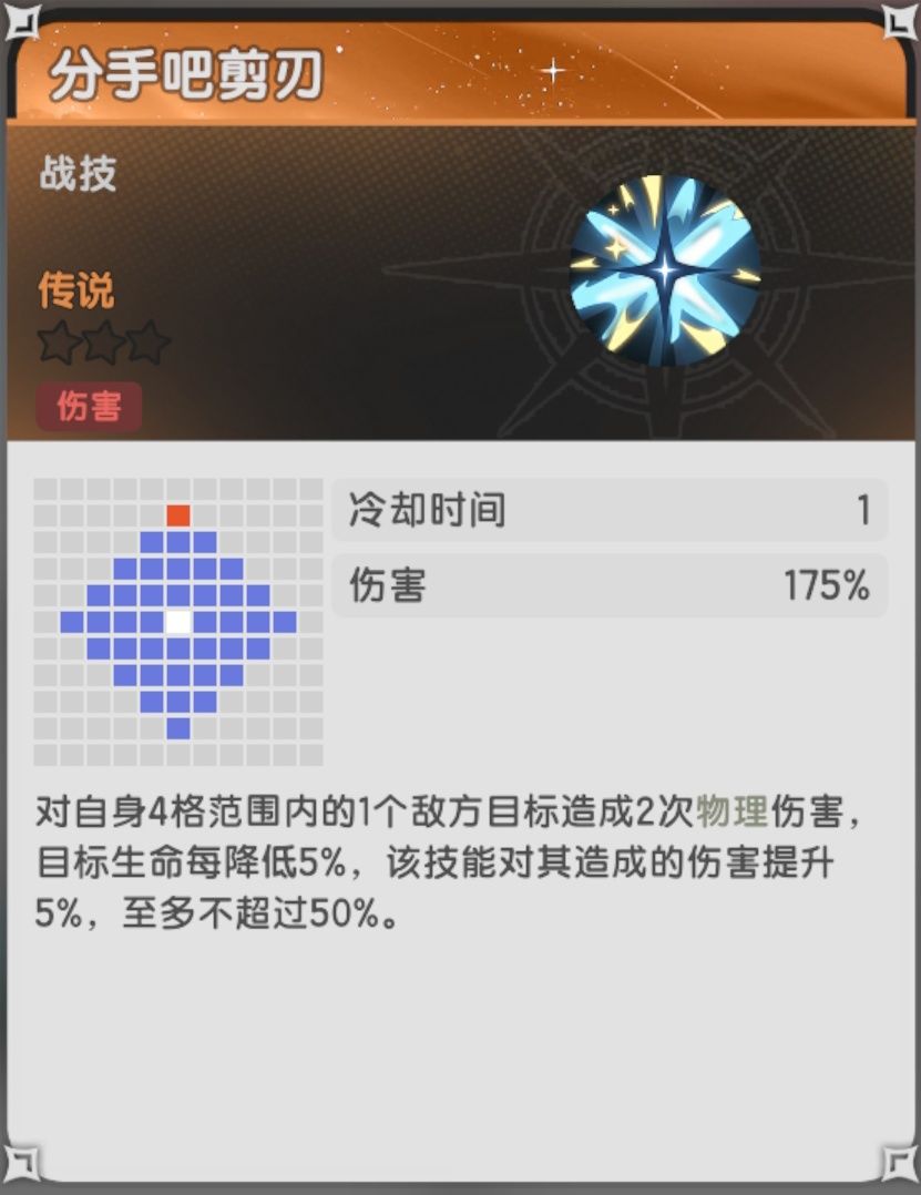 解析:60级好感给30技能碎片兑换券*1,自身技能组有一定强度,最高26%的受到伤害增加,有一定的辅助能力,被动的首次受伤免伤+2格范围瞬移提供了一定的生存保障,算是还不错的术士伙伴,推荐抽取。
