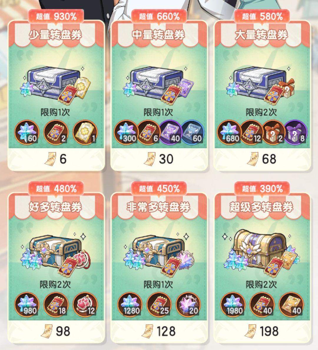 ①6+30+68+98+198*2=598元,共得118张;