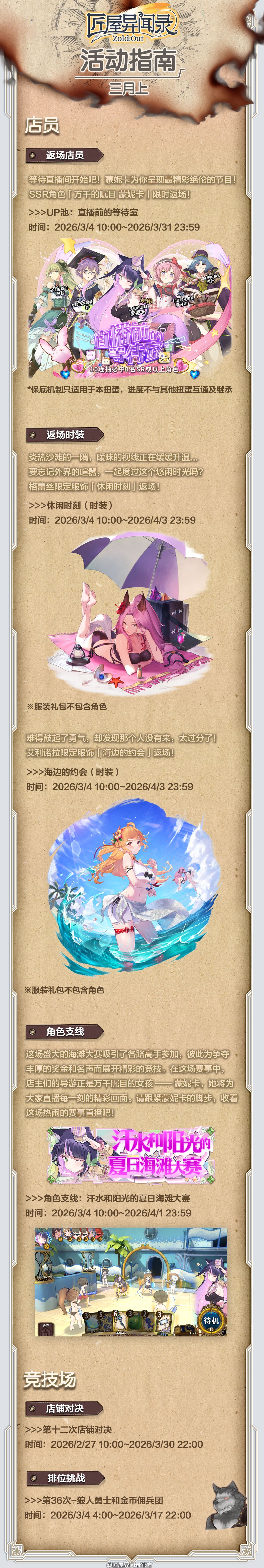3月4日10点版本更新后,SSR店员「万千的注目 蒙妮卡」限时返场,为大家带来最精彩绝伦的直播盛宴!格蕾丝限定服饰「休闲时刻」与艾利诺拉限定服饰「海边的约会」浪漫返场,与你共度悠闲时光~