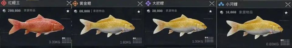 总共有4种鲤鱼,小河鲤价值1.8w;大肥鲤价值3.8w;黄金鲤价值8.8w;红鲤王价值28w。