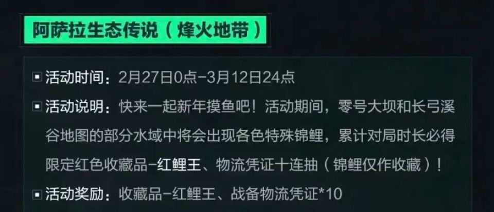 三角洲阿萨拉生态传说活动上线,全新大红收藏品-红鲤王限时收集开启!本期为大家带俩大坝长弓红鲤王点位,据说摸到红鲤王能带来一整年好运!