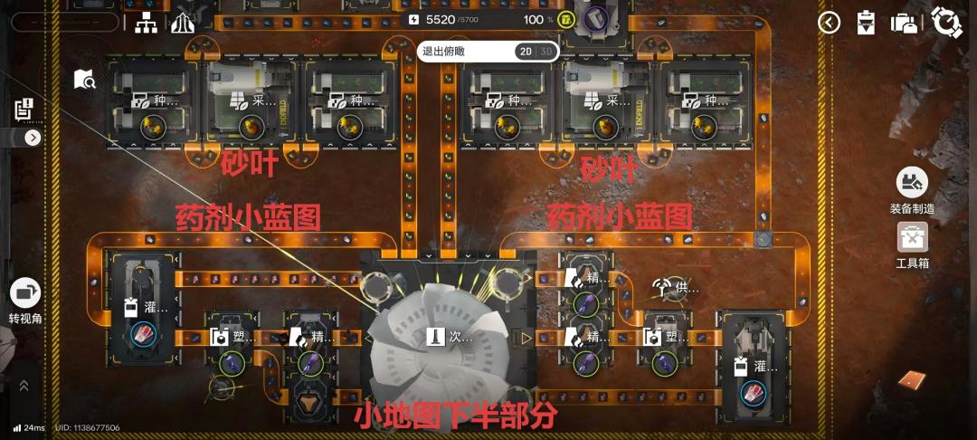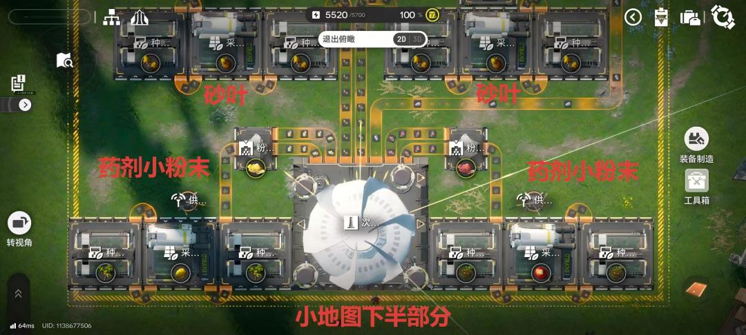 2、因为大地图有效区间70x70,而大药剂蓝图14x46,所以刚好放置6个,无需修改。需要注意3条传送带对应的植物是砂叶,2条传送带对应的植物是荞花(柑实)。