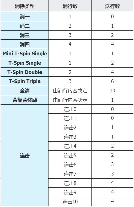 - 四行消(Tetris):一次性消除四行,直接送出4行垃圾。