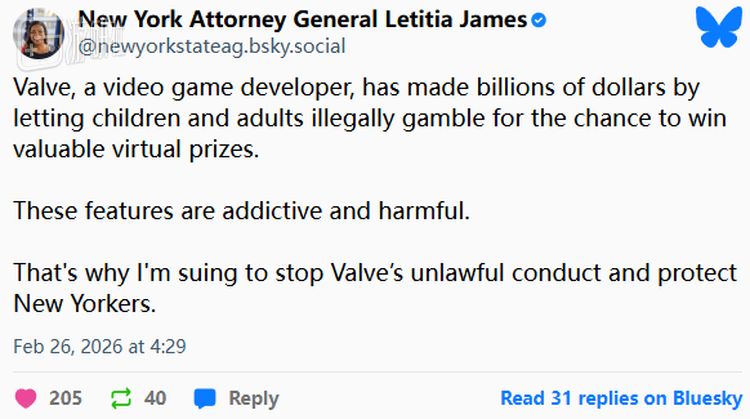 就在今日,美国纽约州总检察长Letitia James在多个社交平台上正式宣布对游戏公司V社提起诉讼,指控旗下的游戏违反了该州的赌博法。