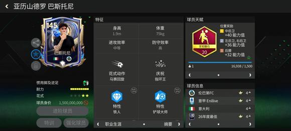 1、巴斯托尼出球能力精准,适合后场发起反击。