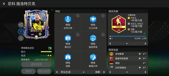 球员天赋:坚如磐石(冲刺速度、长传、人盯人、拦截、侵略性)