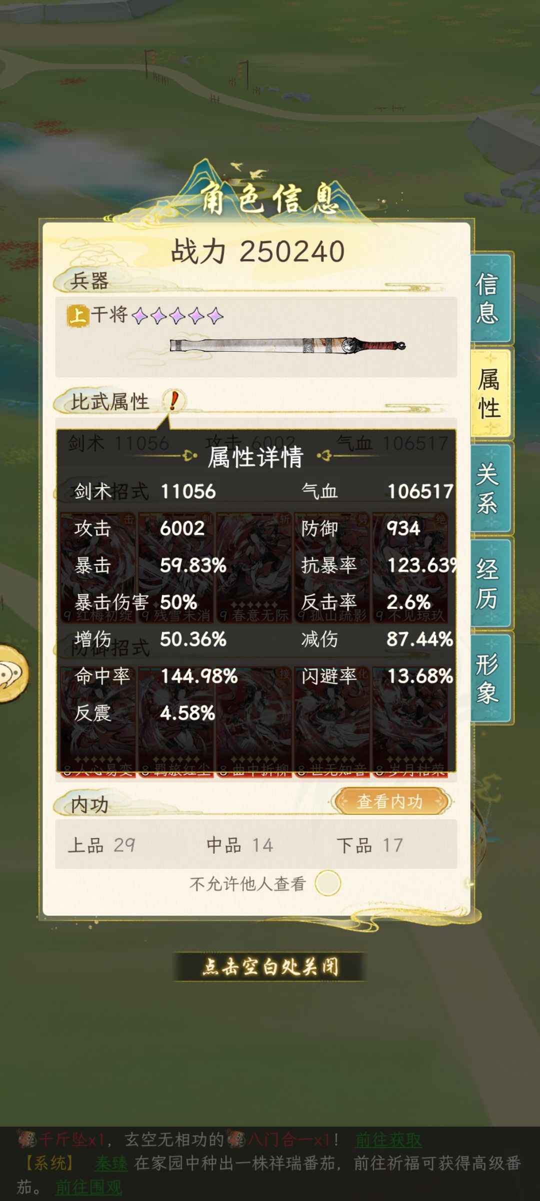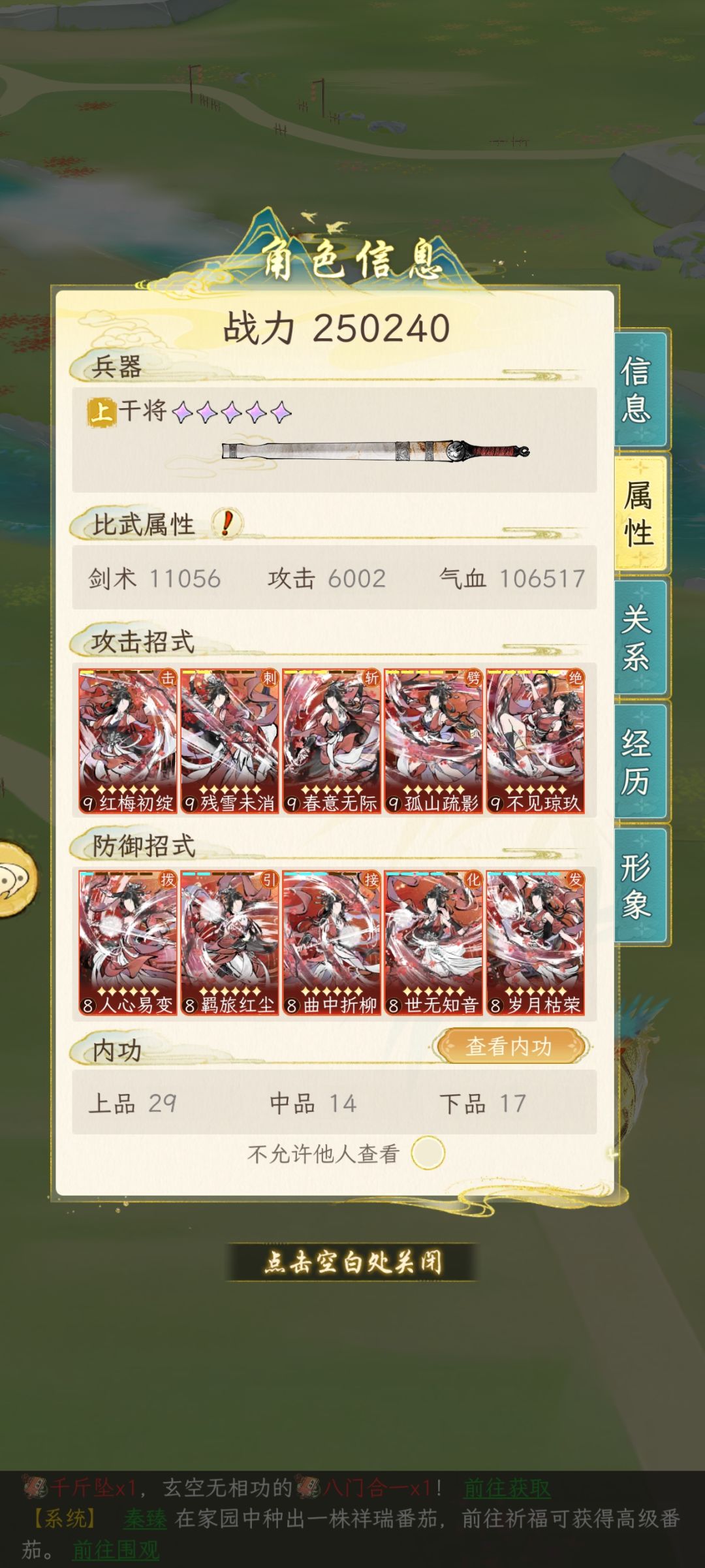 ,不过还是说一句七弦落英剑本质上在个人看来其实是一门辅助武学,不具备的很强的进攻性,可以说进攻性很弱,若非要说有进攻性,同样的面板那还不如玩越女唐门等其他流派呢。纪念一下,七弦落英剑全部参满