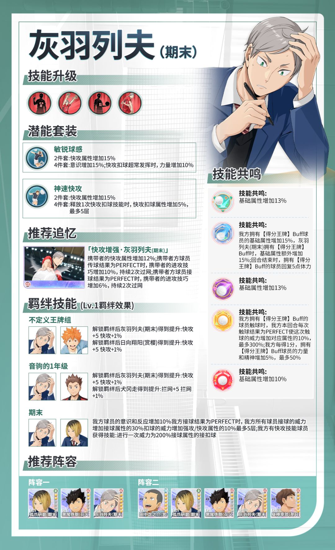 📚 下面带你一张图了解「灰羽列夫-期末(MB)」适合的潜能套装、适配的追忆、技能共鸣介绍、角色独特羁绊、优质阵容组合!