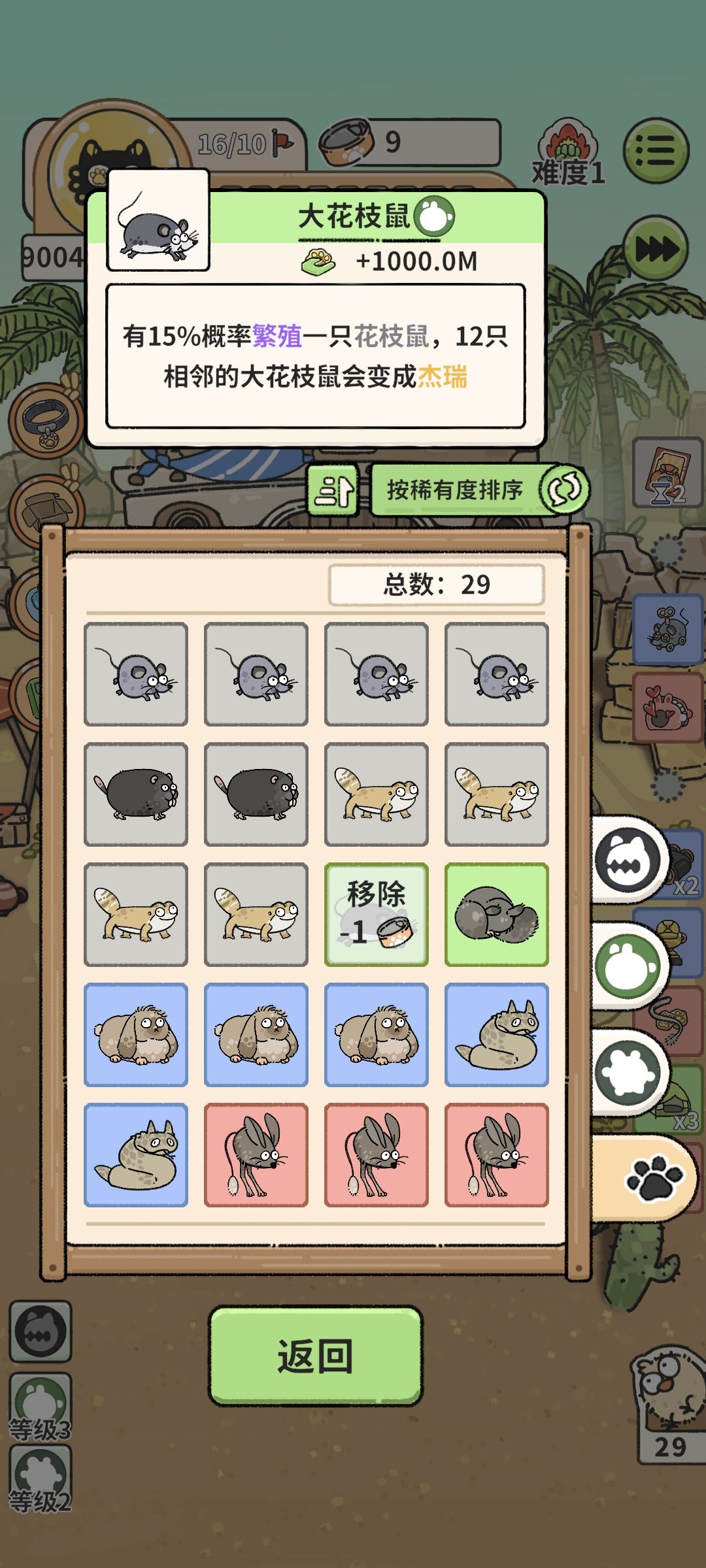 花枝鼠一个已经1000M上限了,每轮获得的钱已经远大于要求了,新动物就找一找能繁殖老鼠的,有帐篷繁殖的新的也是1000M,无限挂机就好了,真爽。
