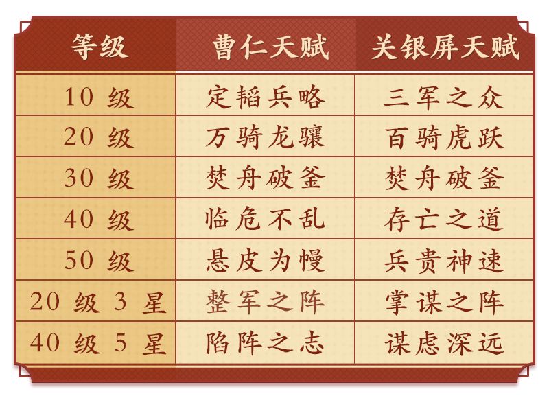 曹仁和关银屏的天赋搭配如下表: