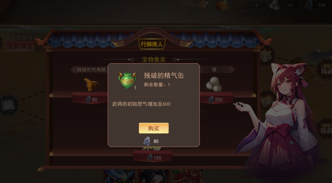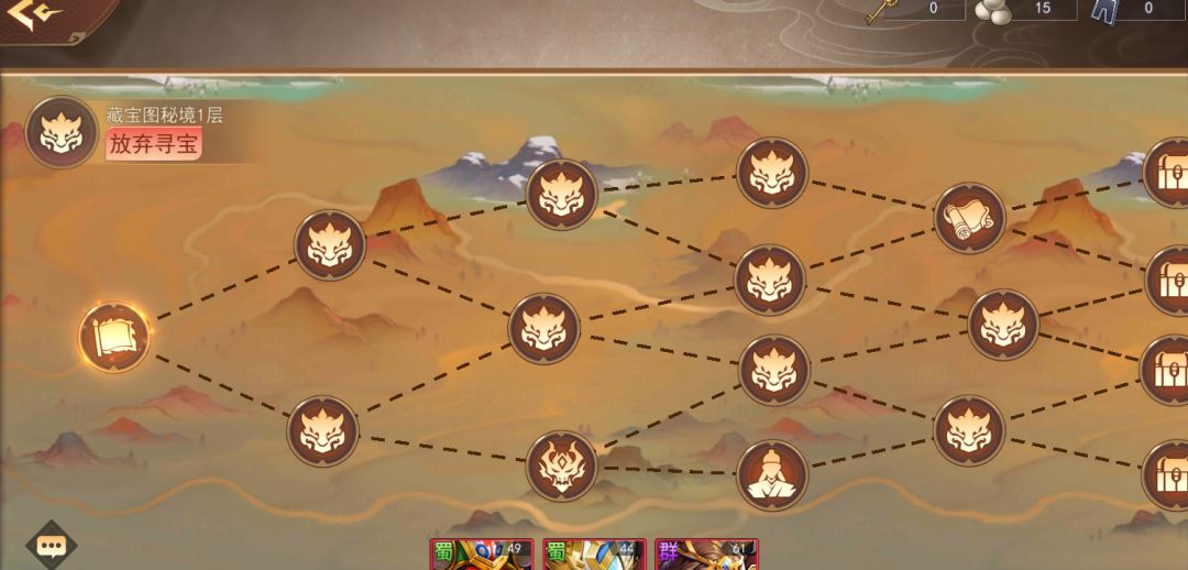 藏宝图需要扫荡副本获得碎片,20个碎片合成一张藏宝图开一局寻宝秘境副本。寻宝秘境中共有五层,每一层到关底BOSS处有不同路线,路线上会遇到各种小怪、特殊事件、宝箱、行脚商人等。进入寻宝秘境初始会有15个馍,每走一步消耗一个,武将全部阵亡,或者没有馍都算失败。