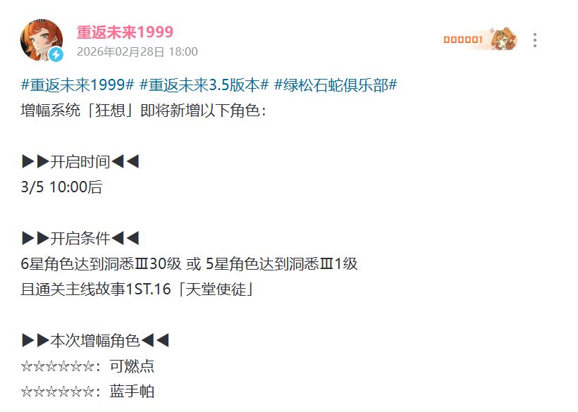 本次增幅开启时间为3月5日10:00后,开启条件为:6星角色达到洞悉 Ⅲ30 级,或5星角色达到洞悉 Ⅲ1级,且通关主线故事1ST.16「天堂使徒」。本次新增的增幅角色为6 星可燃点与6星蓝手帕,两位角色解锁狂想后将获得技能强化与属性提升,进一步丰富队伍搭配与战术思路。