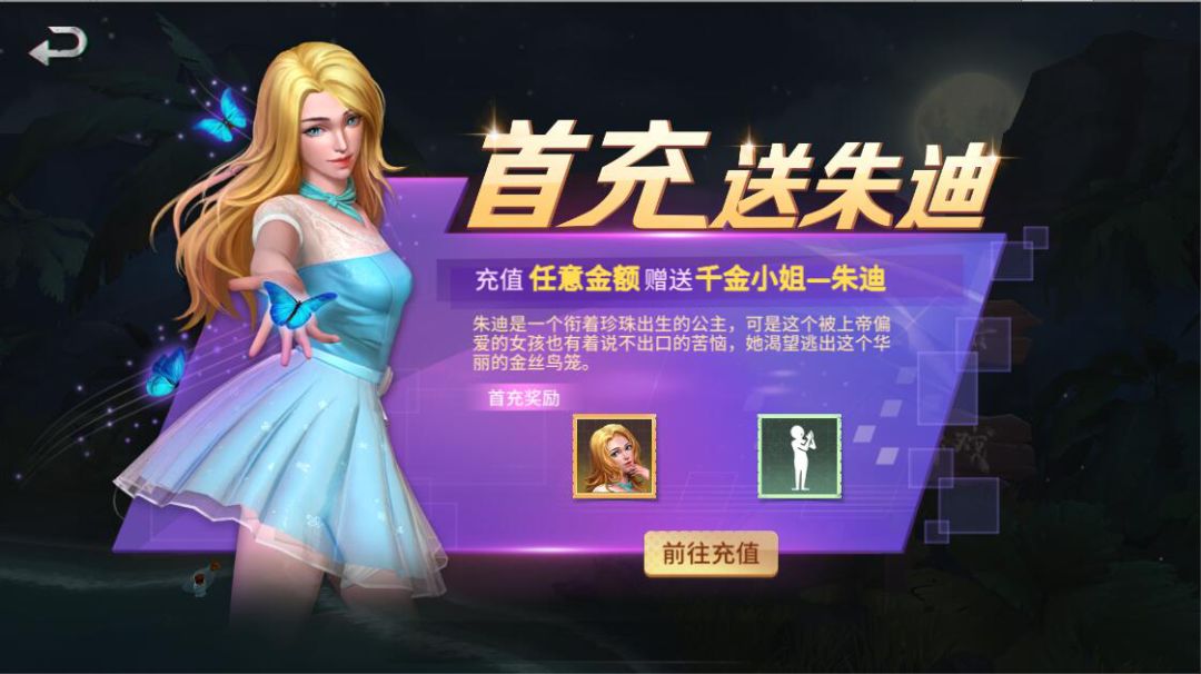 首充送朱迪:首次充值任意金额即可获得角色:千金小姐—朱迪,以及朱迪得休闲动作:赞扬