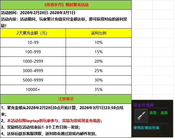 玩家在活动时间内累充达到指定金额后咨询客服领取,只限taptap玩家