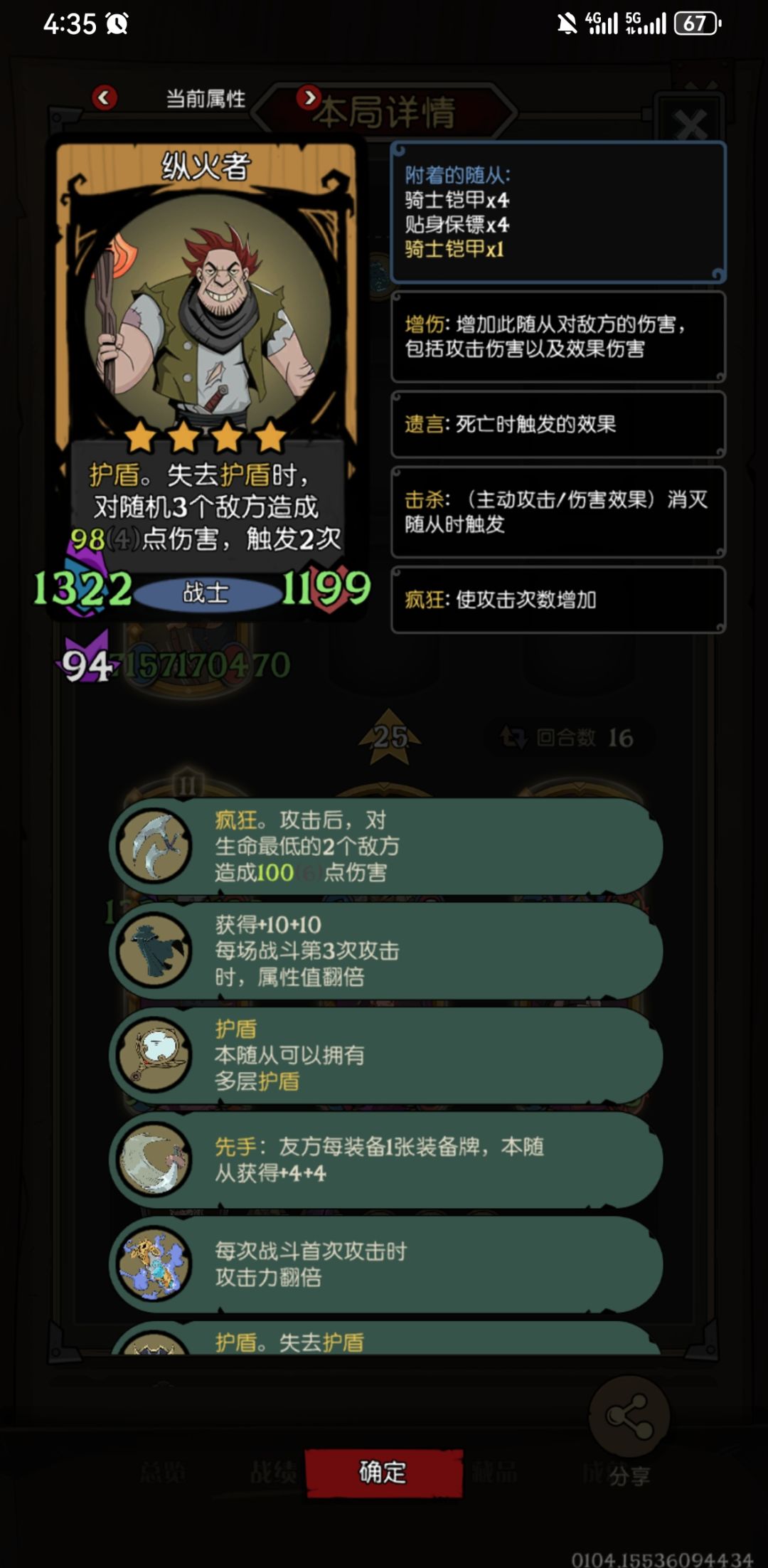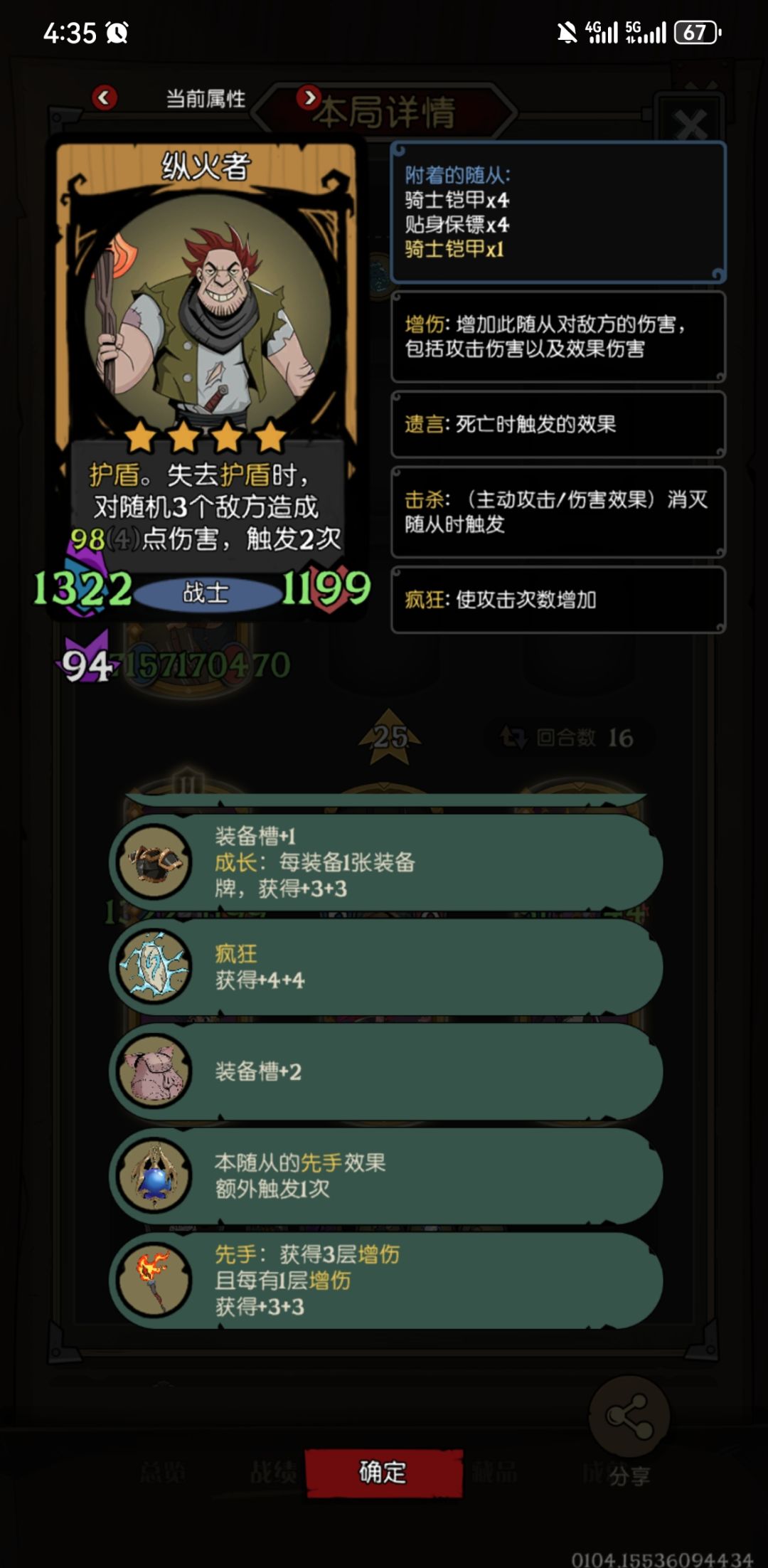 狗头养的纵火未必不如星裔(有龙的局,因为增伤加属性那个装备太强了),对面星裔,吞星吃了好几次的神射,而且有3倍属性有陨铁盾,但是一个收祝福的勇士全防住了,这把前期一直没找到纵火,前期养的船长,所以很多槽都给了船长,是有点可惜的,6本以后找到两回合才找到纵火,如果有可能其他所有配件都不动就纵火动,就要玩战士