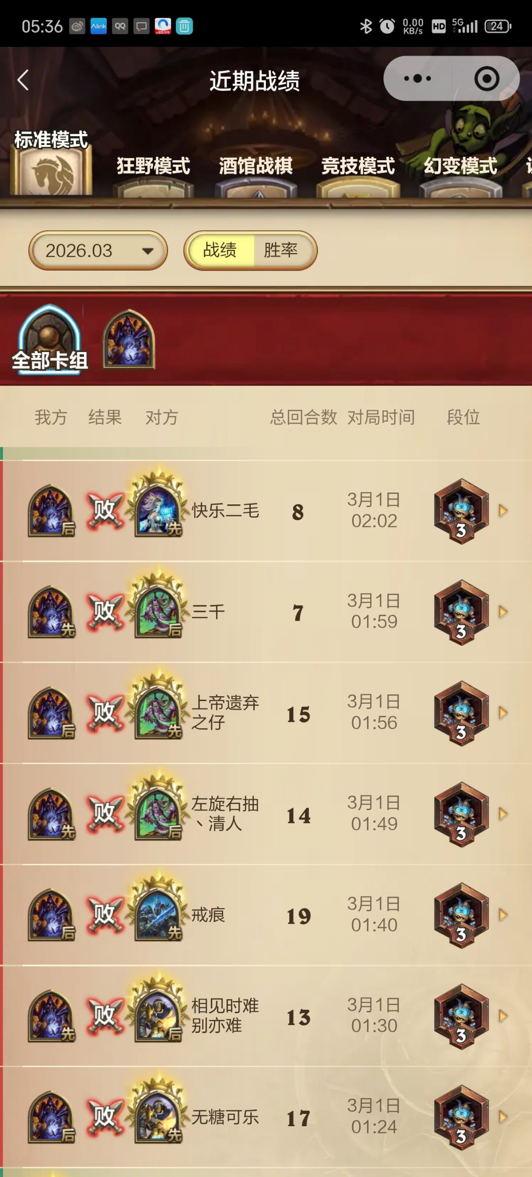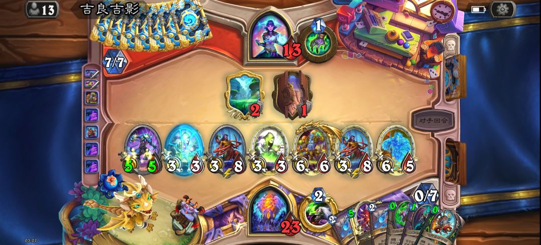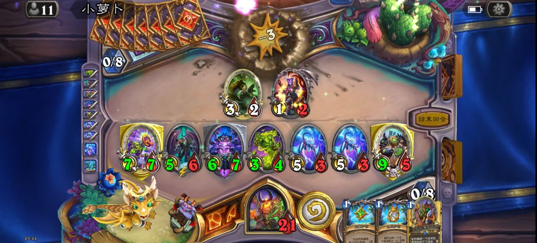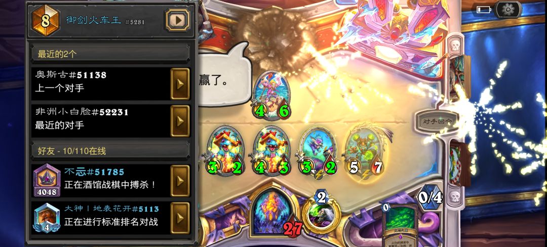 小鸡分段被系统不公平欺负的很惨,我的塞入掉血排一个劲来,对面大瞎们二十几张牌一个劲出塞入的海盗和门,还好我熬过了起步运势不佳的一小时