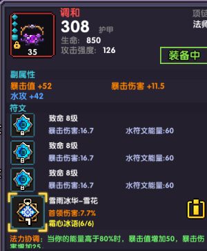 最后的最后,装备中属性的选择,需要根据自身的属性进行调整。达到有大师情况423暴击,无大师500暴击,穿透3400,水攻爆伤越高越好