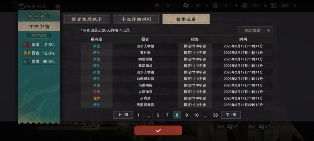 380抽抽满了,一共抽出来5个太阳神鸟,歪了3次:小宋香炉、毛公鼎、万工轿。没领160保底井的,准备拿去领酒账,正好有红卡可以把太阳神鸟剩下的俩命拉满。
