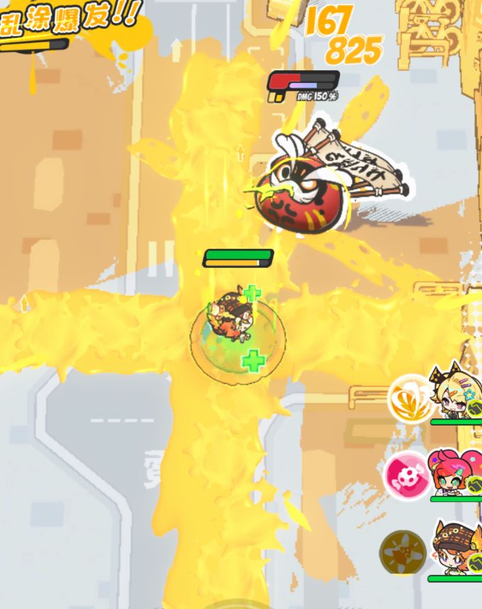 必杀技是希尔米的核心技能,她将向上下左右泼洒油漆波浪,对5*25米的十字范围内的敌人造成伤害和强力的染色效果。释放后为全队角色恢复等同于希尔米攻击力+固定数值的生命值。