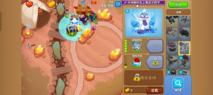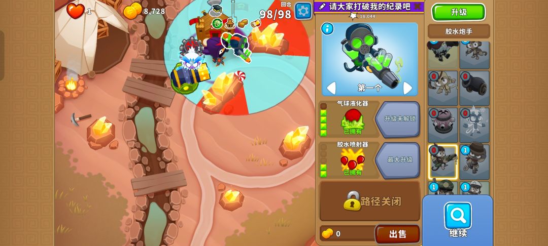 只有足够多的穿透和攻速才能通过,伤害太高反而不是好事。因此有个好方法是先在上方放下420猴子村,再在两个角落里放下502回旋镖猴和510冰猴,接着在下方位置放下025大炮,然后在回旋镖的右侧放下420胶水炮手,最后在冰猴的上方放下103刺钉塔,钱够了快速升到204就行!