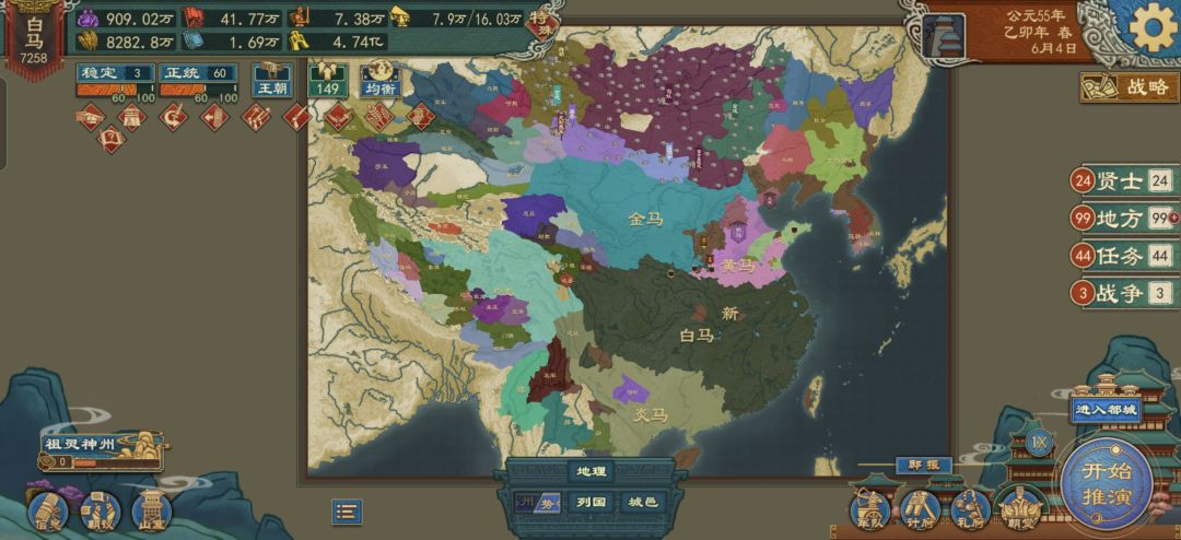 2、州郡布局地图太奇怪,州郡的形状稀奇古怪,一点不好看,有些大,有些小,新加地图之后,扬州,梁州,居然是在原基础上直接扩大城市范围,这样要称帝,那就必须要管理很大一片地,建议每个州都变成像允州那种大小,扩大地图之后,在基础上再增加一些州,如果觉得很麻烦,直接把两个洲统力100%作为称帝、建立王朝以及方国升礼法的条件去除。