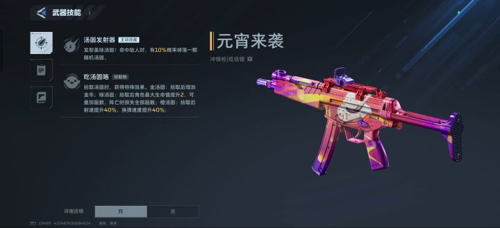 该武器拥有汤圆发射器与吃汤圆咯两个技能,命中敌人有概率掉落汤圆,拾取后可获得金币、生命值加成、射速与换弹速度提升等效果。